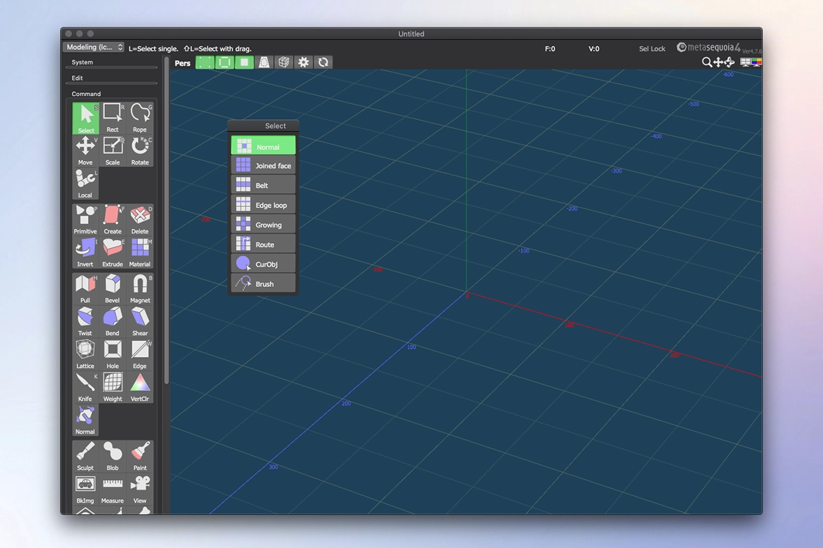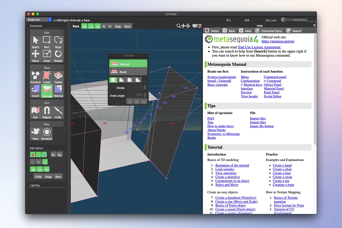 Metasequoia提供的一个有趣的功能是,它允许您通过单击鼠标在多个界面布局之间切换,并更改命令面板和工具栏的内容,以便它是执行某些操作的理想选择。当第一次启动Metasequoia时,它以Beginner模式启动,它提供了一组有限的功能,但相对容易掌握并且是新手学习绳索的最佳方式。还有其他三种可用的模式,专为建模和映射而设计,但您也可以创建自己的布局并保存它们以便于访问。