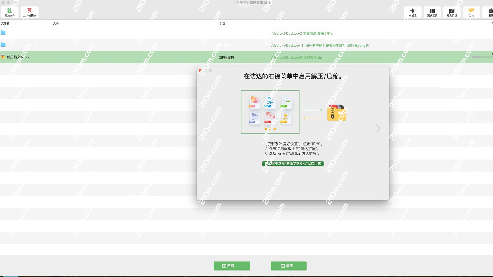 此外,Oka解压专家 Pro for Mac还具备一些高级功能,如分卷压缩、密码保护等,满足了用户对于文件管理和安全性的更高需求。同时,它还支持Finder扩展,用户可以直接在访达中进行压缩、解压和预览操作,无需额外打开软件,进一步提升了使用便捷性。
