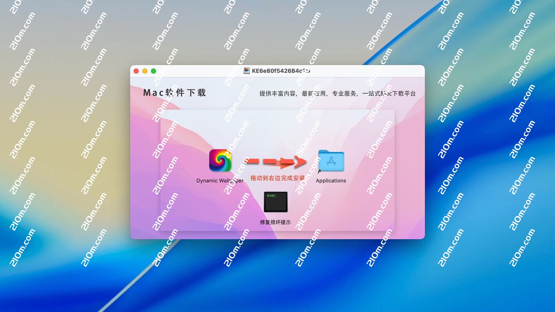 安装包下载完成后,将左侧Dynamic Wallpaper拖动到右侧的应用程序中,即可完成安装。
