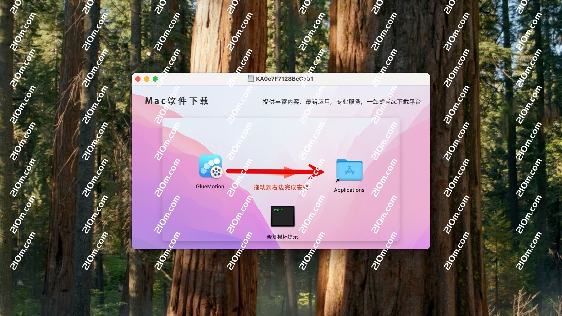 GlueMotion Mac下载完成后打开,拖动左侧的软件到右侧应用程序中即可