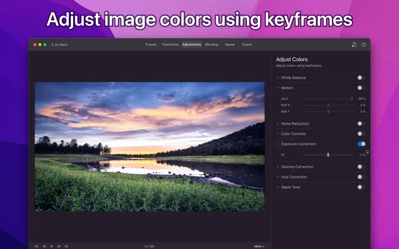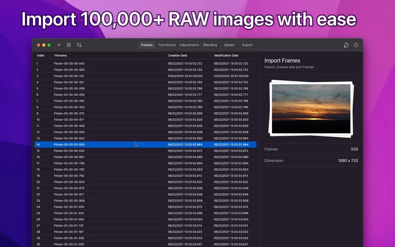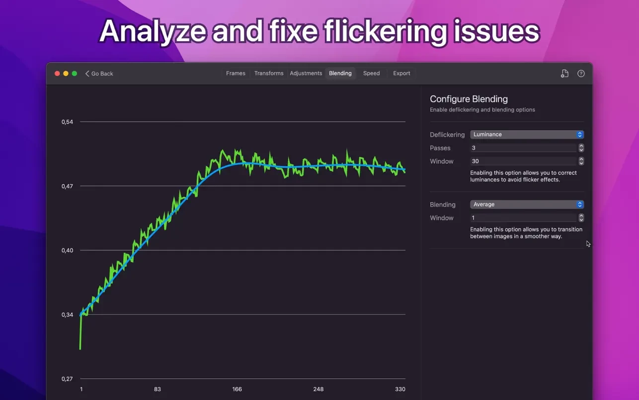 - 延时拍摄时,各帧之间的亮度可能会发生变化。这些添加了不需要的闪光效果,称为闪烁。GlueMotion可以毫不费力地消除这种影响。