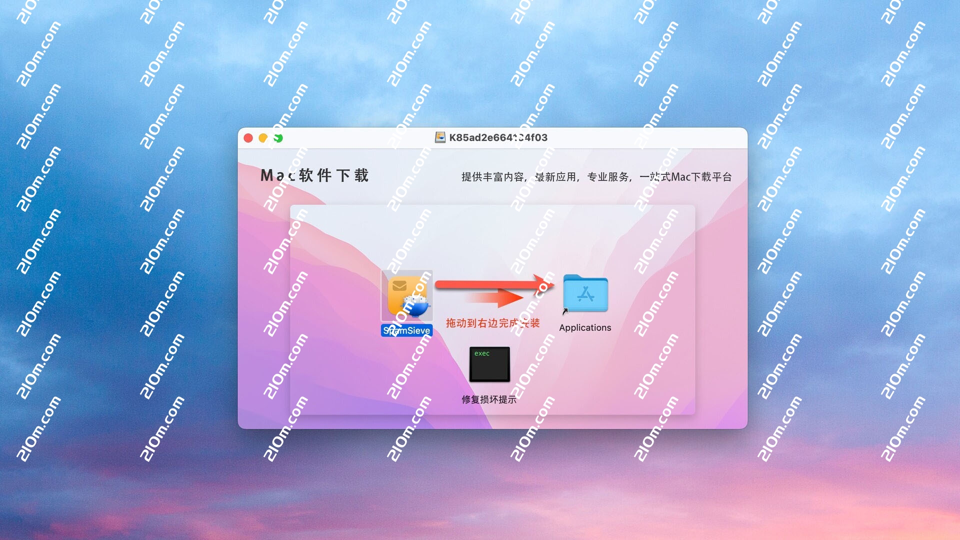 下载镜像包,将左侧【SpamSieve】拖拽至右侧【Applicatios】应用程序中进行安装。