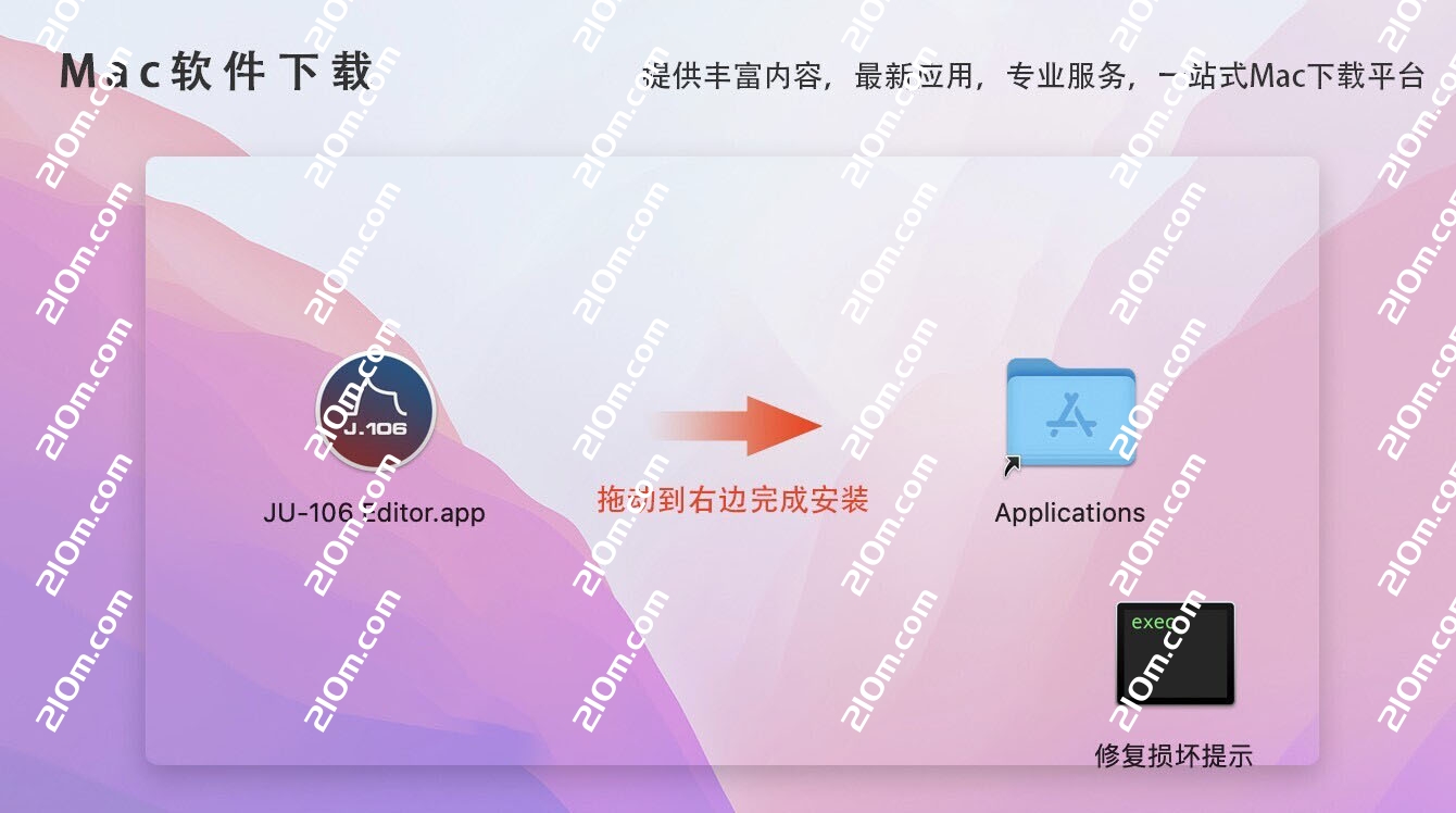 JU-106 Editor破解版下载完成后打开,拖动左侧的软件到右侧应用程序中即可