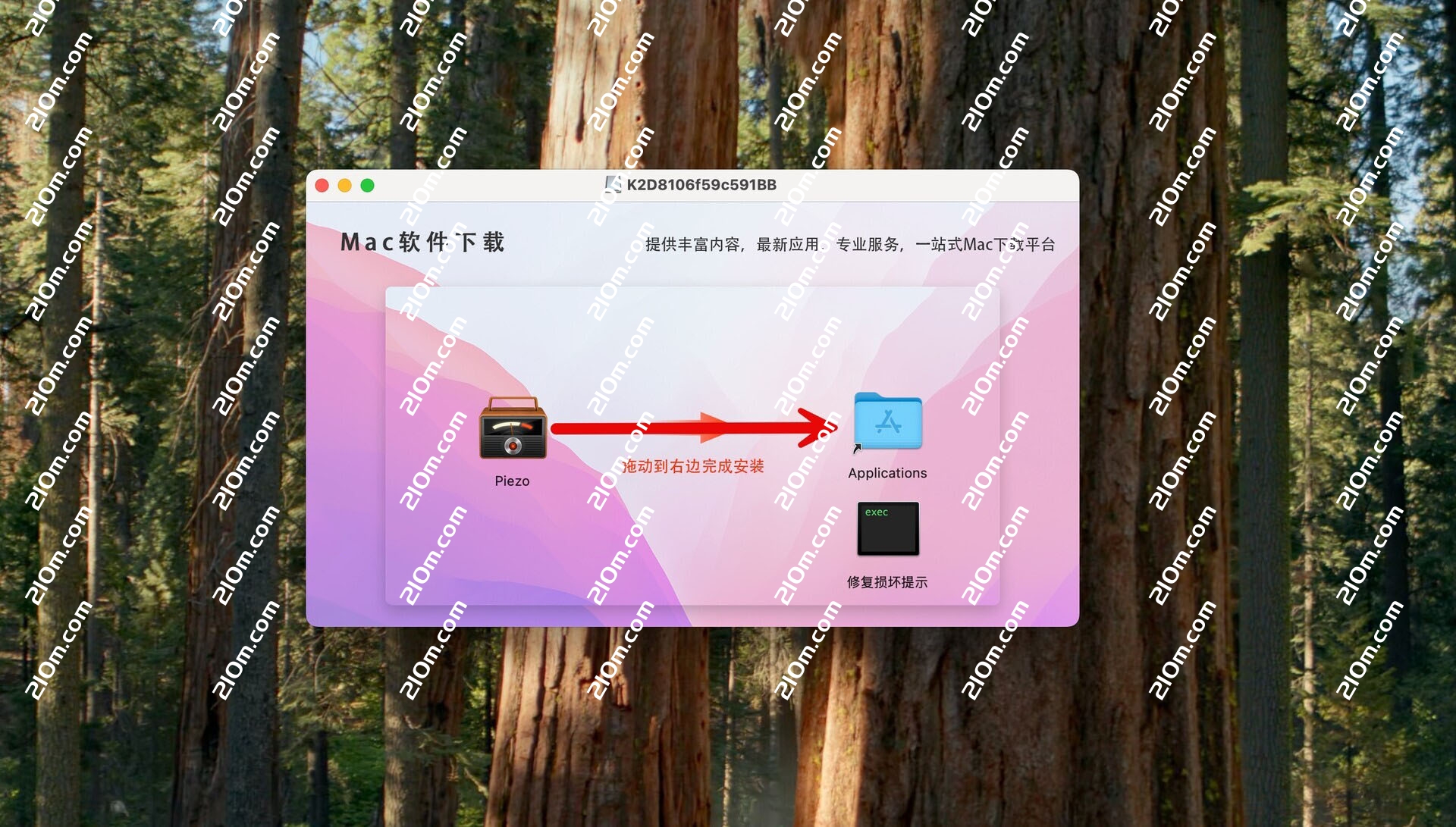 软件安装包下载完成后,拖动左侧的Piezo软件到右侧的应用程序中进行安装。