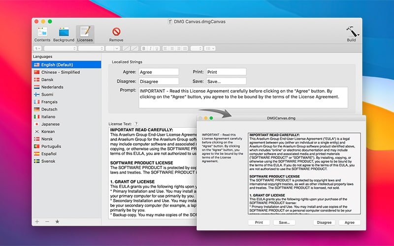 时是否需要磁盘映像提示许可协议?不是问题 不要花几个小时试图弄清楚自己; 只需将许可证的文本放入DMG Canvas即可完成。它甚至支持样式和多种语言。