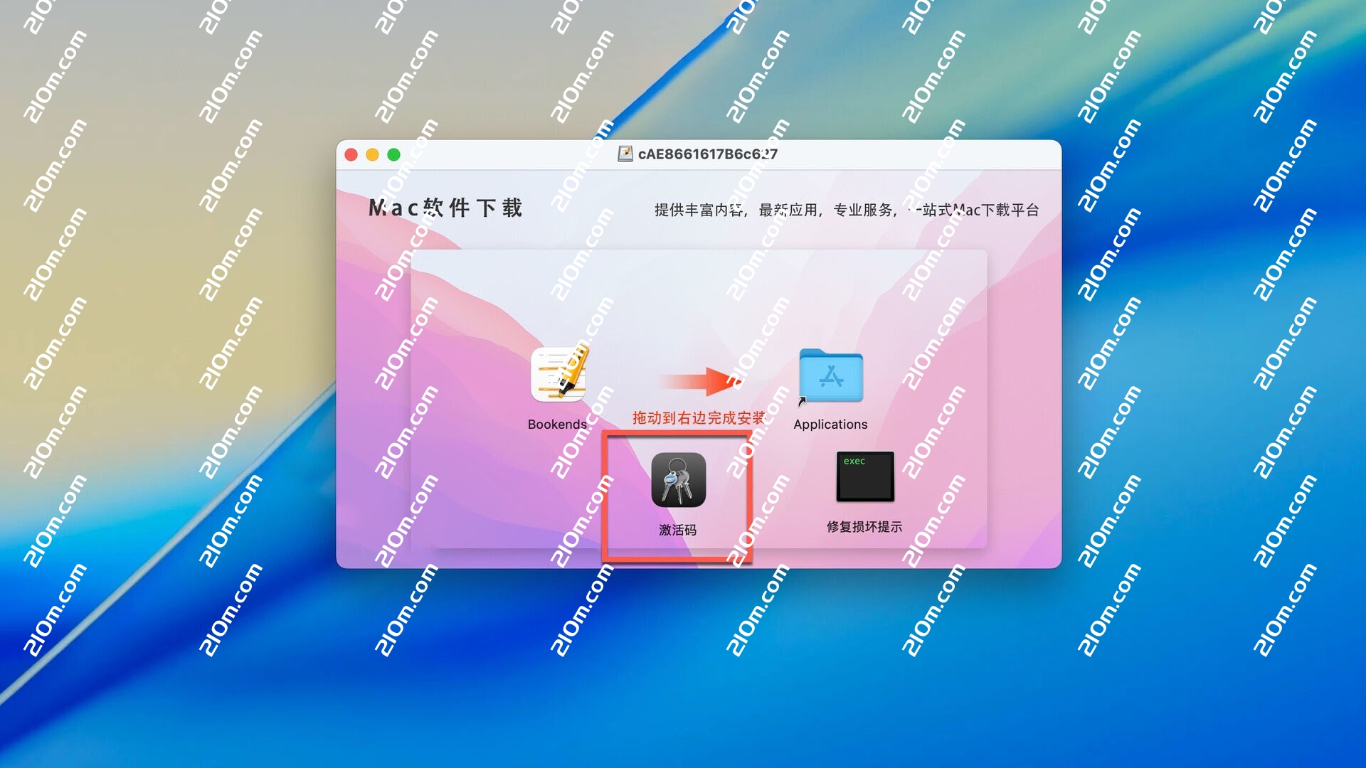Bookends拖拽至右侧Applicatios应用程序中进行安装,等待静默安装完毕即可。