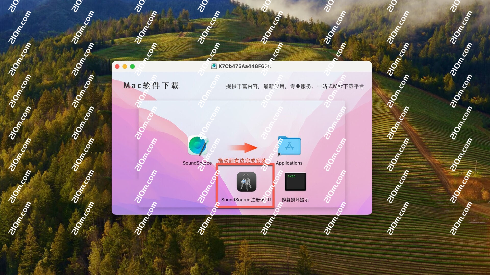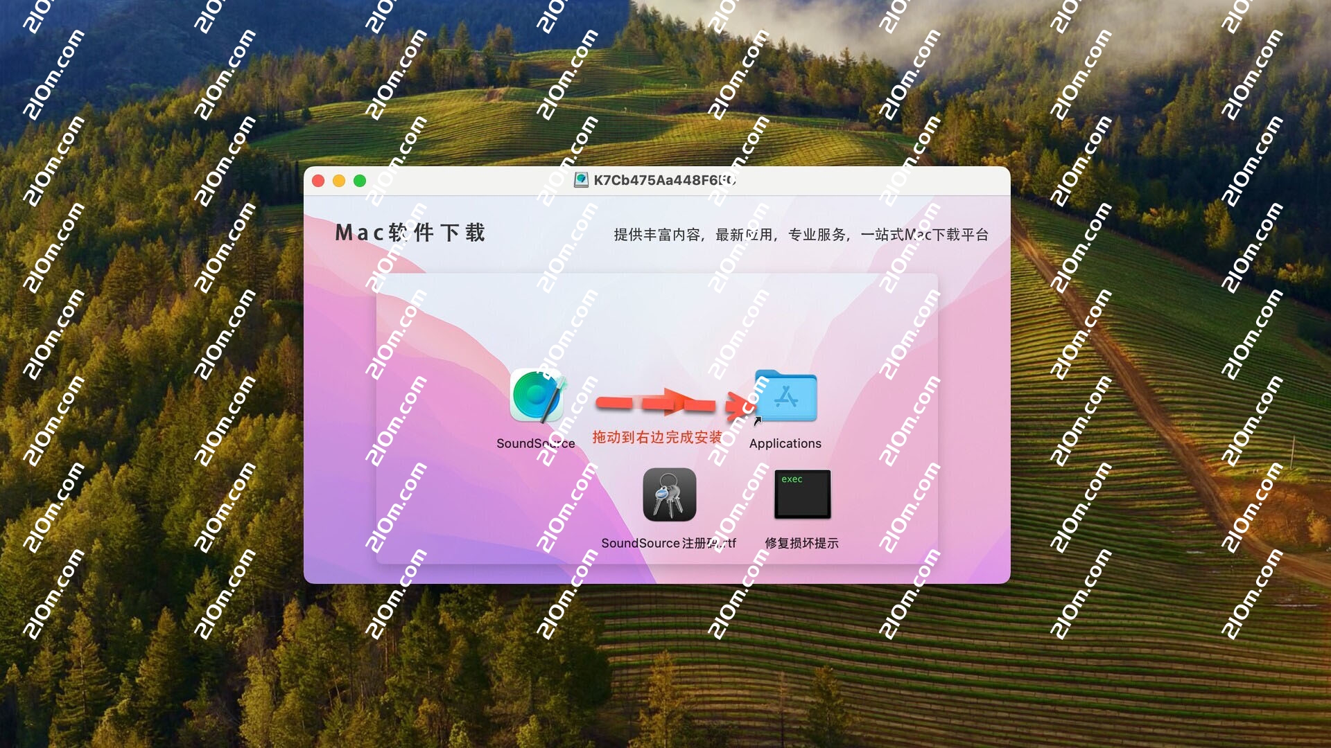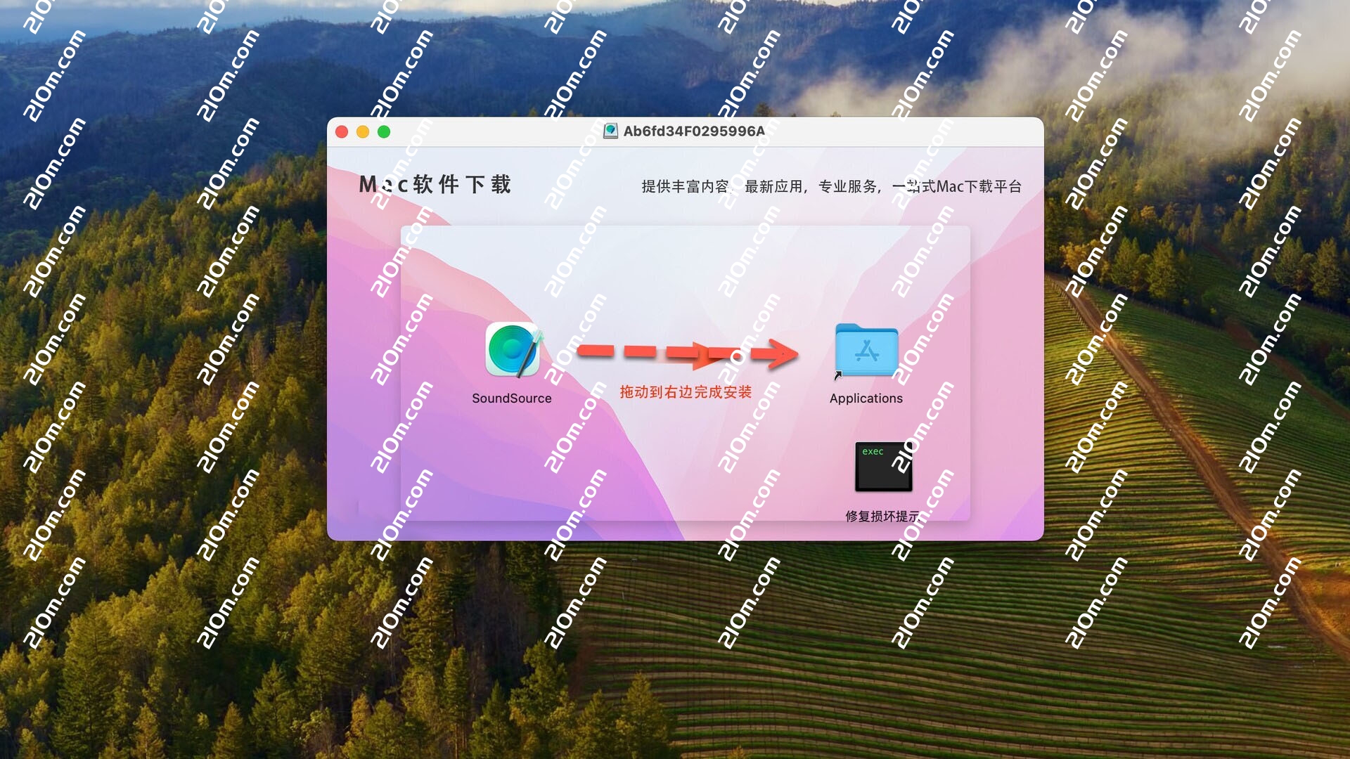 软件安装包下载完成后,将左边的SoundSource拖动到右侧的应用程序中进行安装即可。