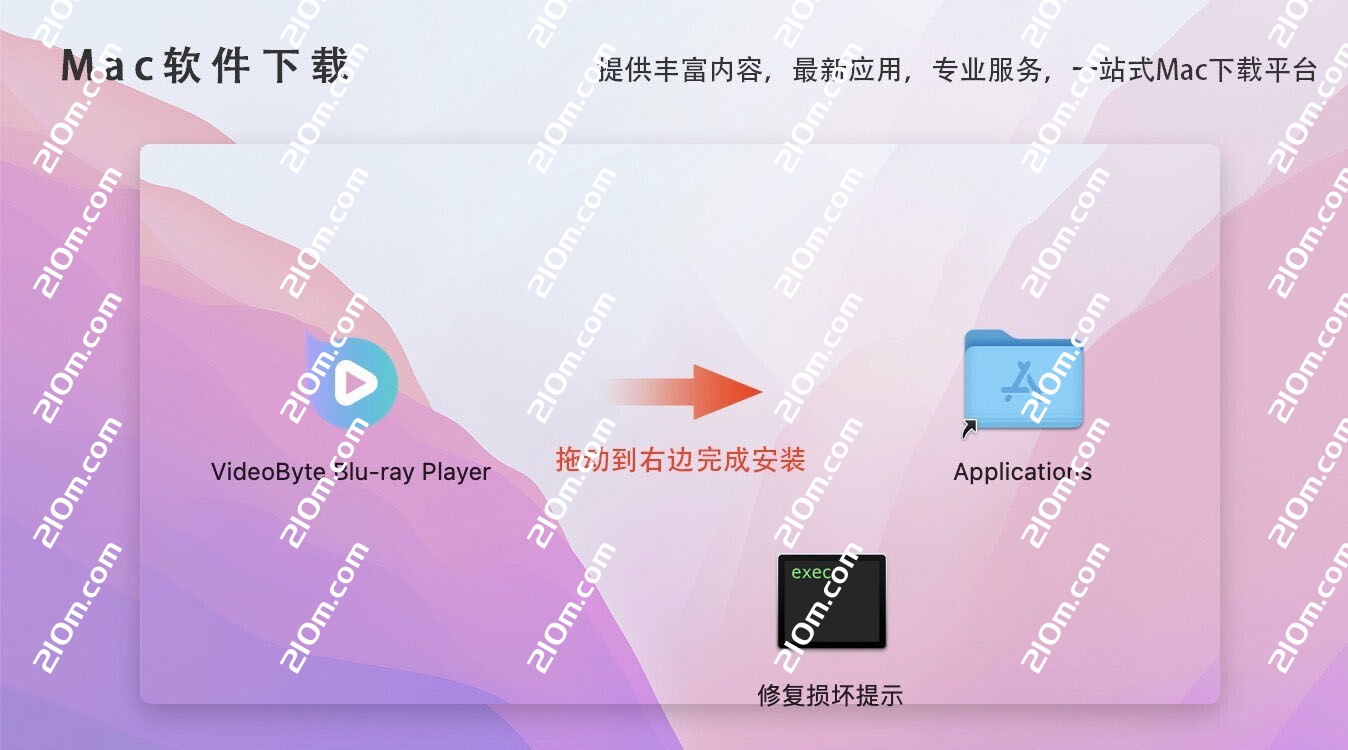 安装包下载完成后,将左侧VideoByte Blu-ray Player拖动到右侧的应用程序中,即可完成安装。