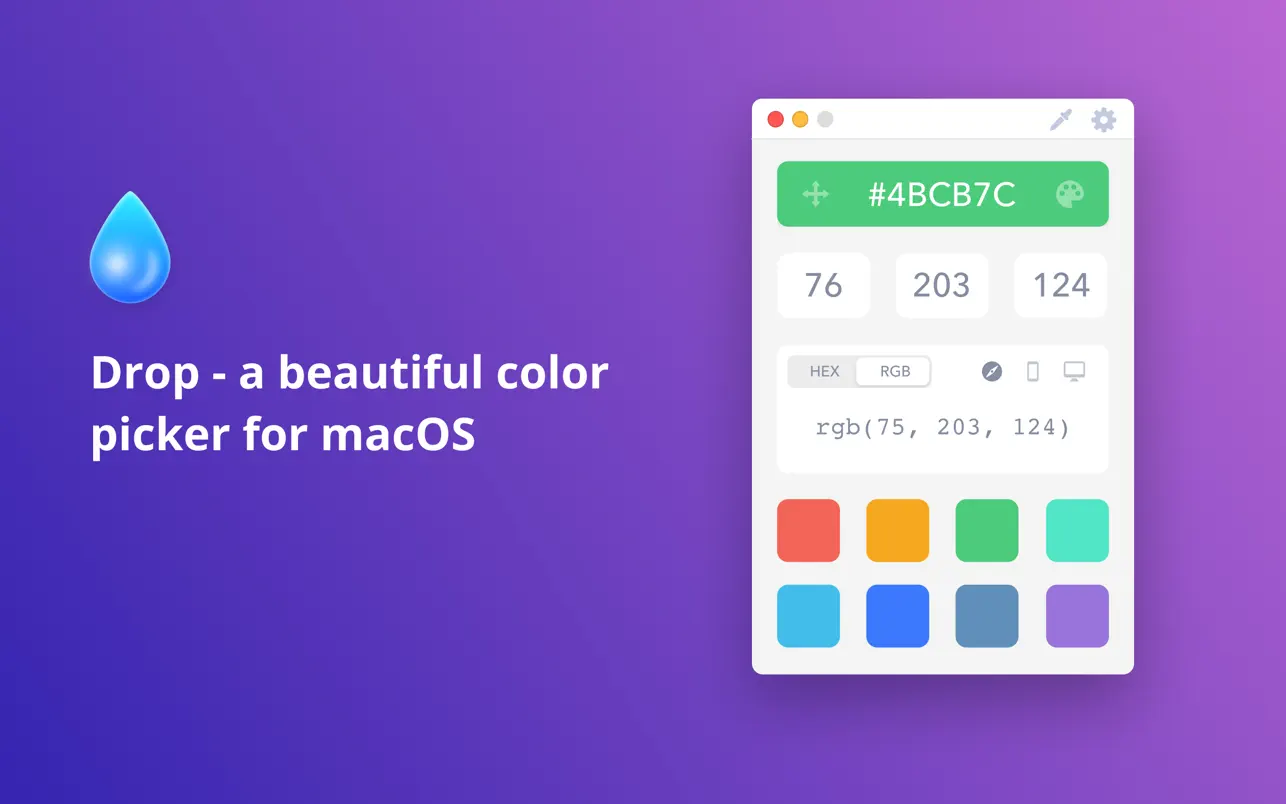 这款功能强大的颜色选择器可让您以首选格式检索复制的颜色。大多数颜色选择器(包括 Apple 的)都无法匹配精确的颜色值。Drop 功能允许您通过切换与所选应用程序关联的颜色配置文件来选择精确的颜色。便捷的缩放功能让您可以以像素级精度复制颜色!保存的颜色可用于创建个性化调色板。