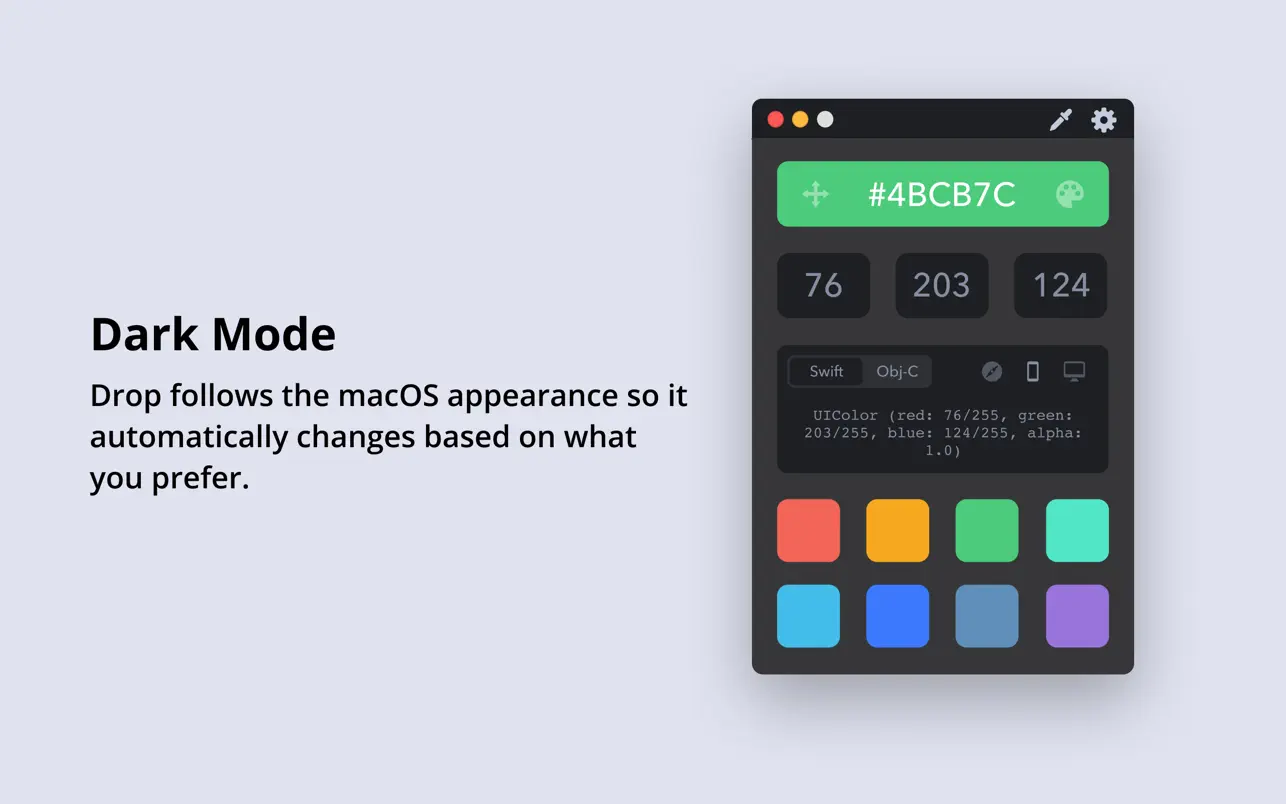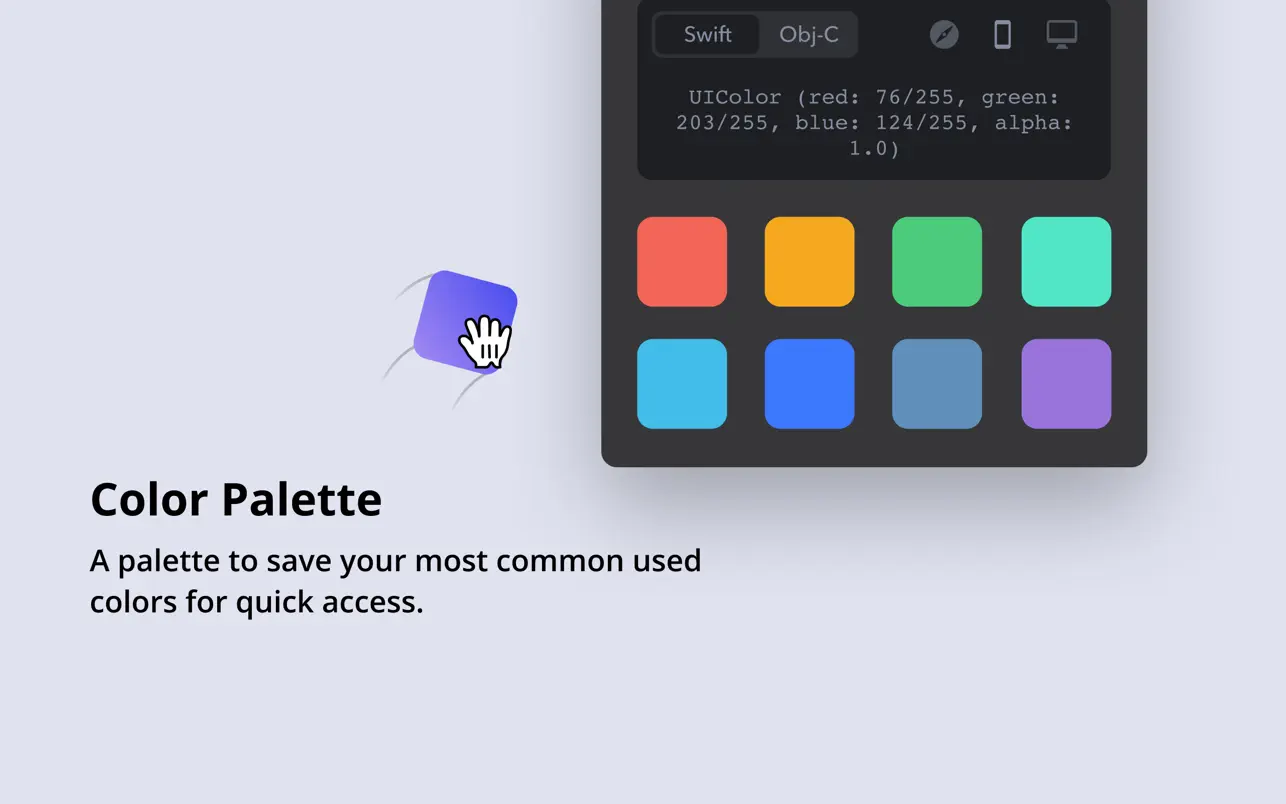 快速切换常用的颜色格式,以便复制颜色:HEX、RGB、Swift UIColor、Swift NSColor、Objective-C UIColor 和 Objective-C NSColor。