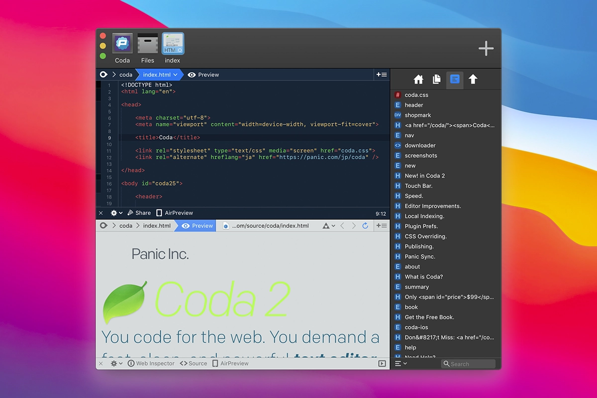 - Coda2 Mac可以让你您的函数类和变量的全站自动完成,都从本地文件中索引。