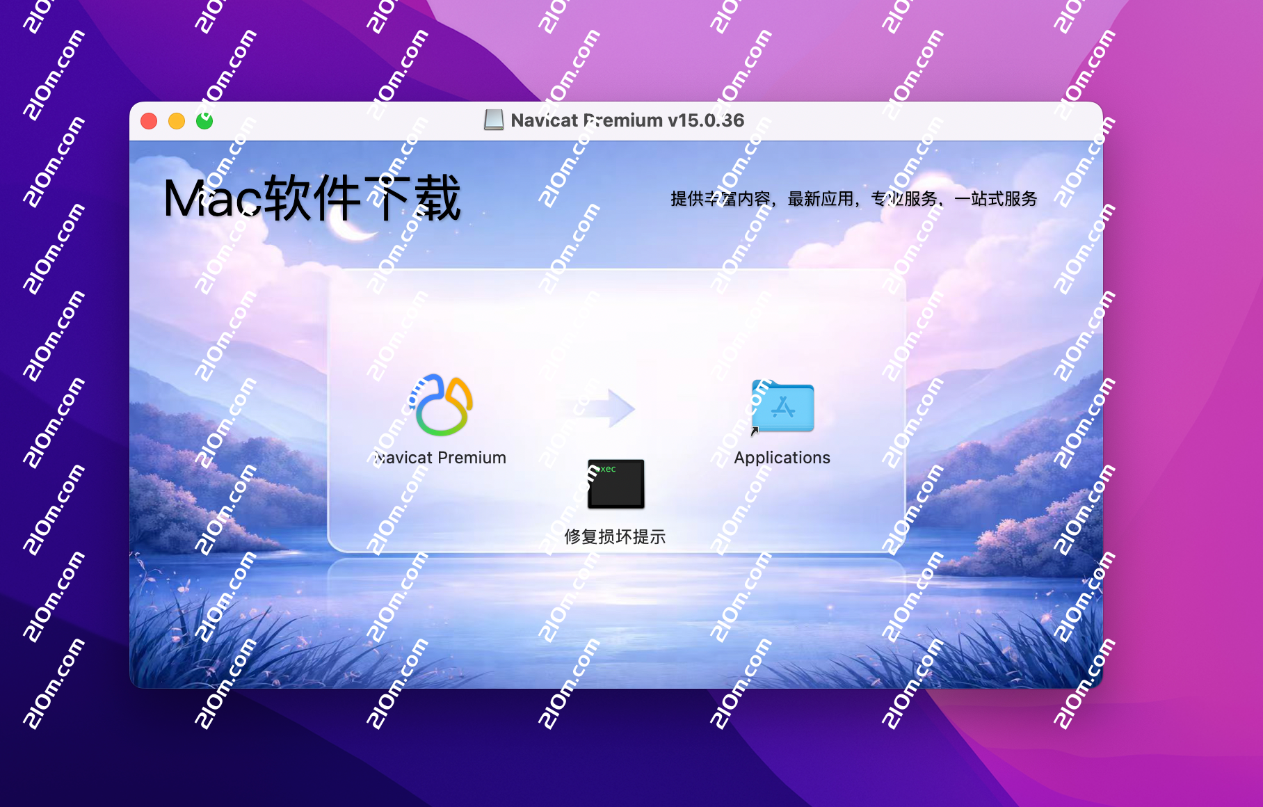 Navicat Premium 15下载完成后打开,将左侧Navicat Premium 15拉到右侧应用程序中。