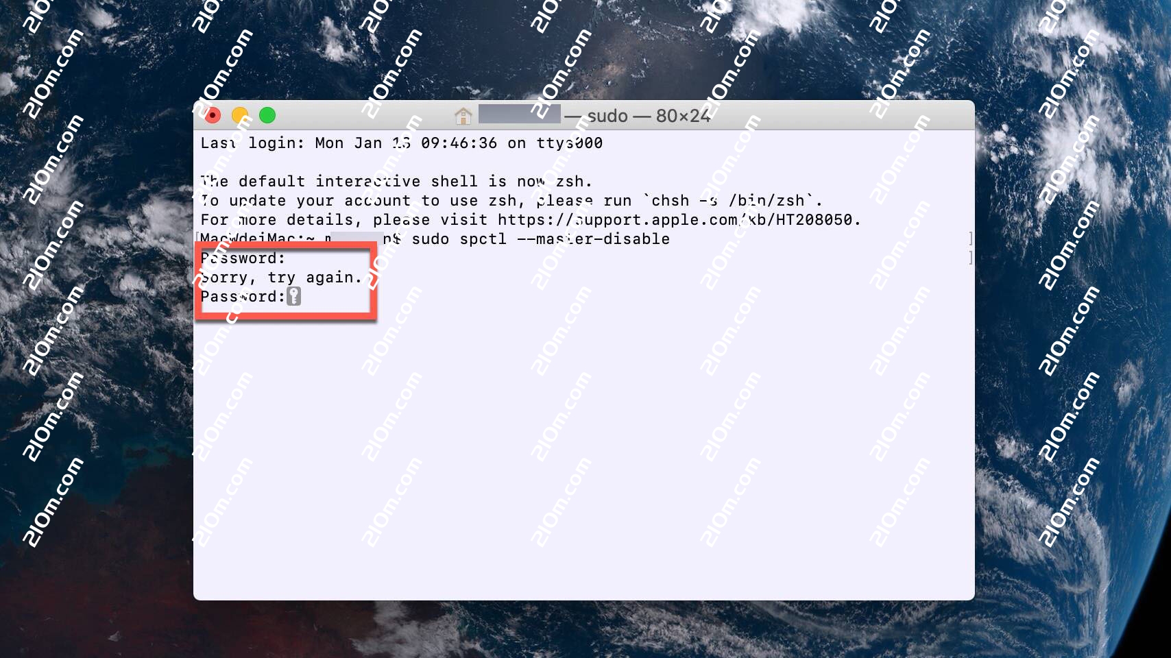 密码输入错误的状态如下图。重新输入即可。如果输错两次,关闭终端,再打开,重新操作即可!!!