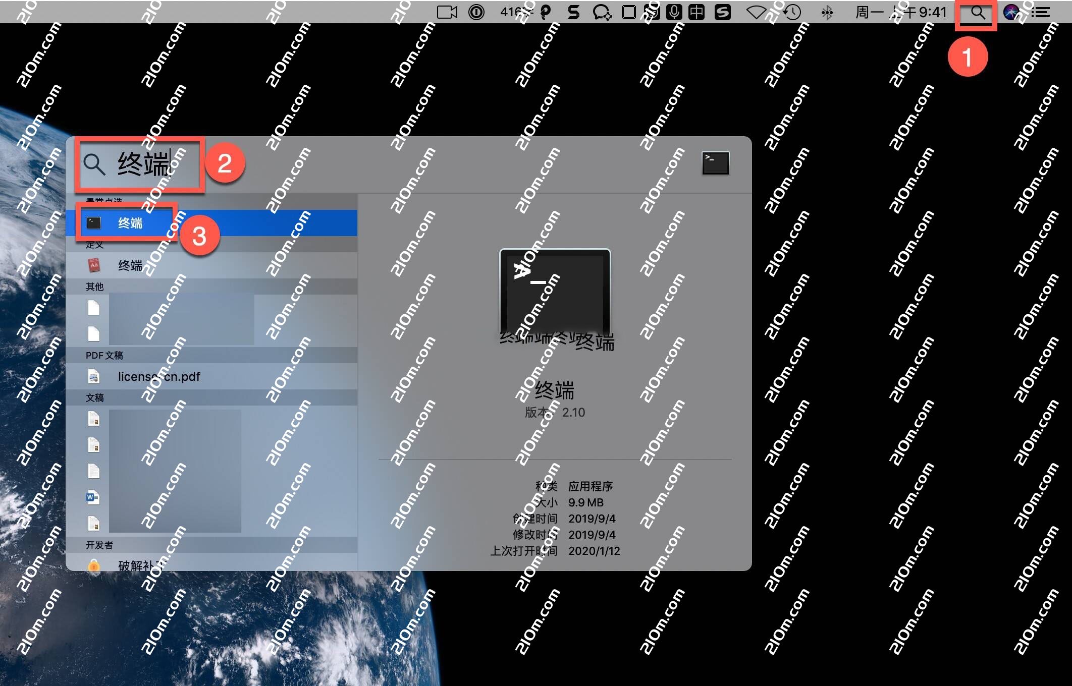 按照图示1.2.3打开Spotlight,输入终端然后按下enter键