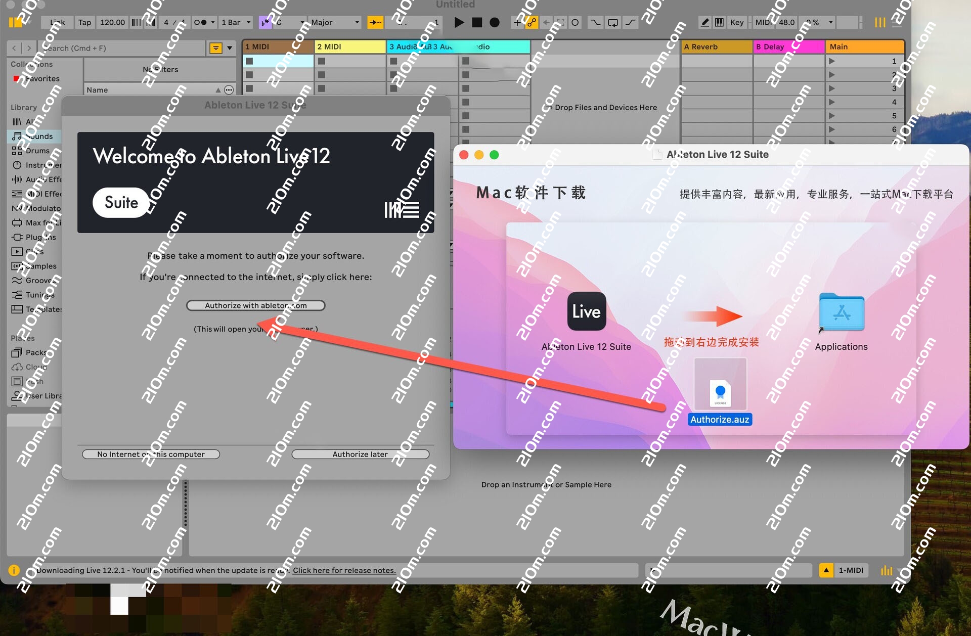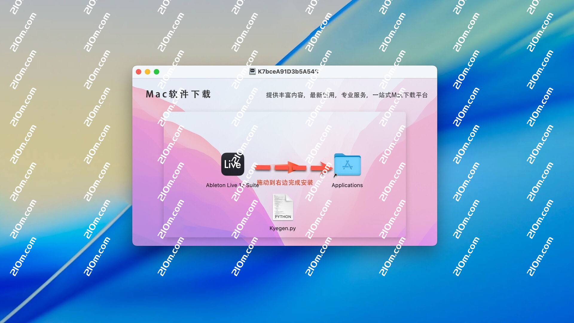 Ableton Live 12破解版下载完成后打开,将左侧Ableton Live 12 Suite拖入右侧应用程序中进行安装