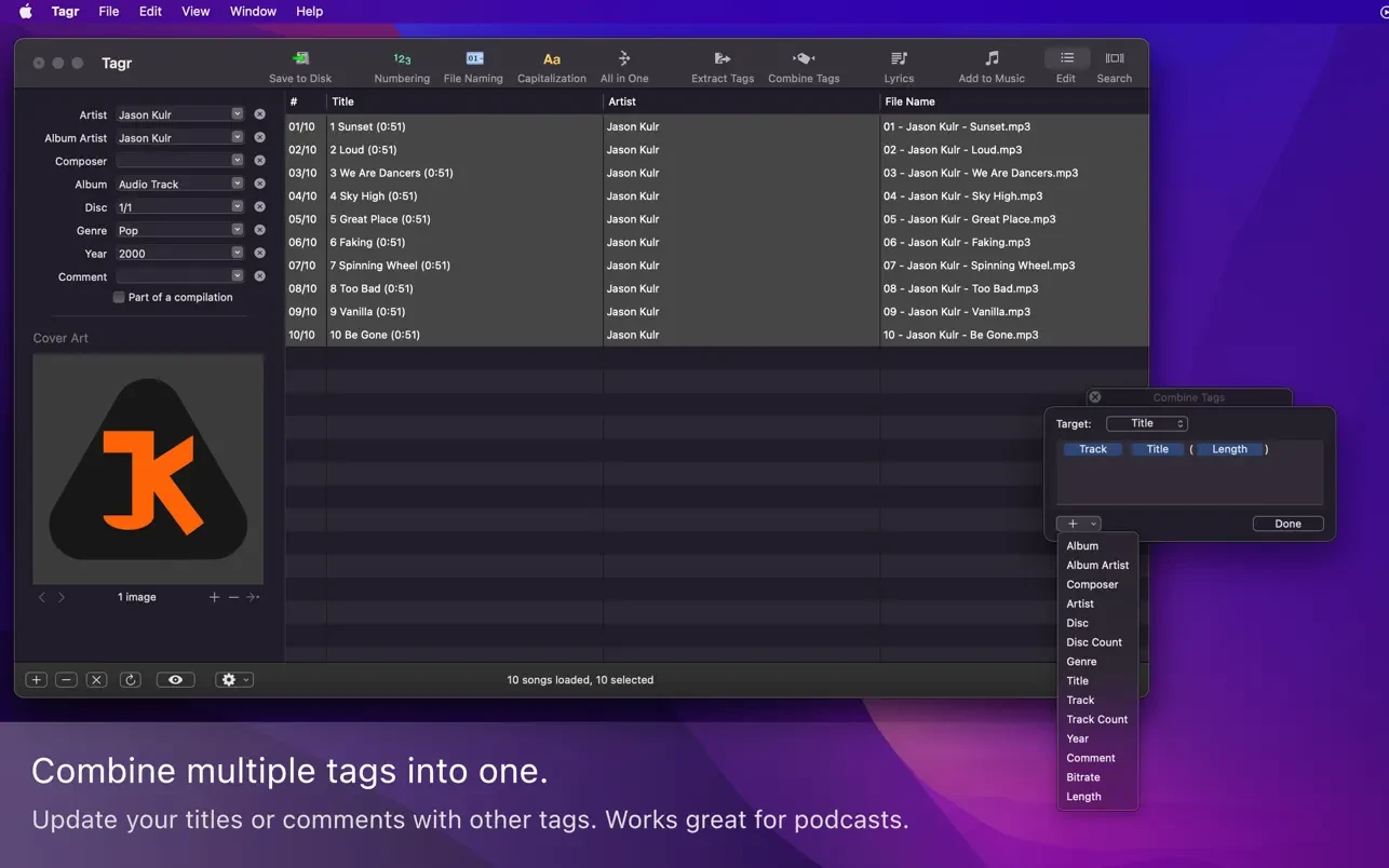 - 受益于与iTunes的紧密集成。将文件从iTunes拖入Tagr,编辑它们,最后只需单击一下即可将更新文件添加回iTunes。