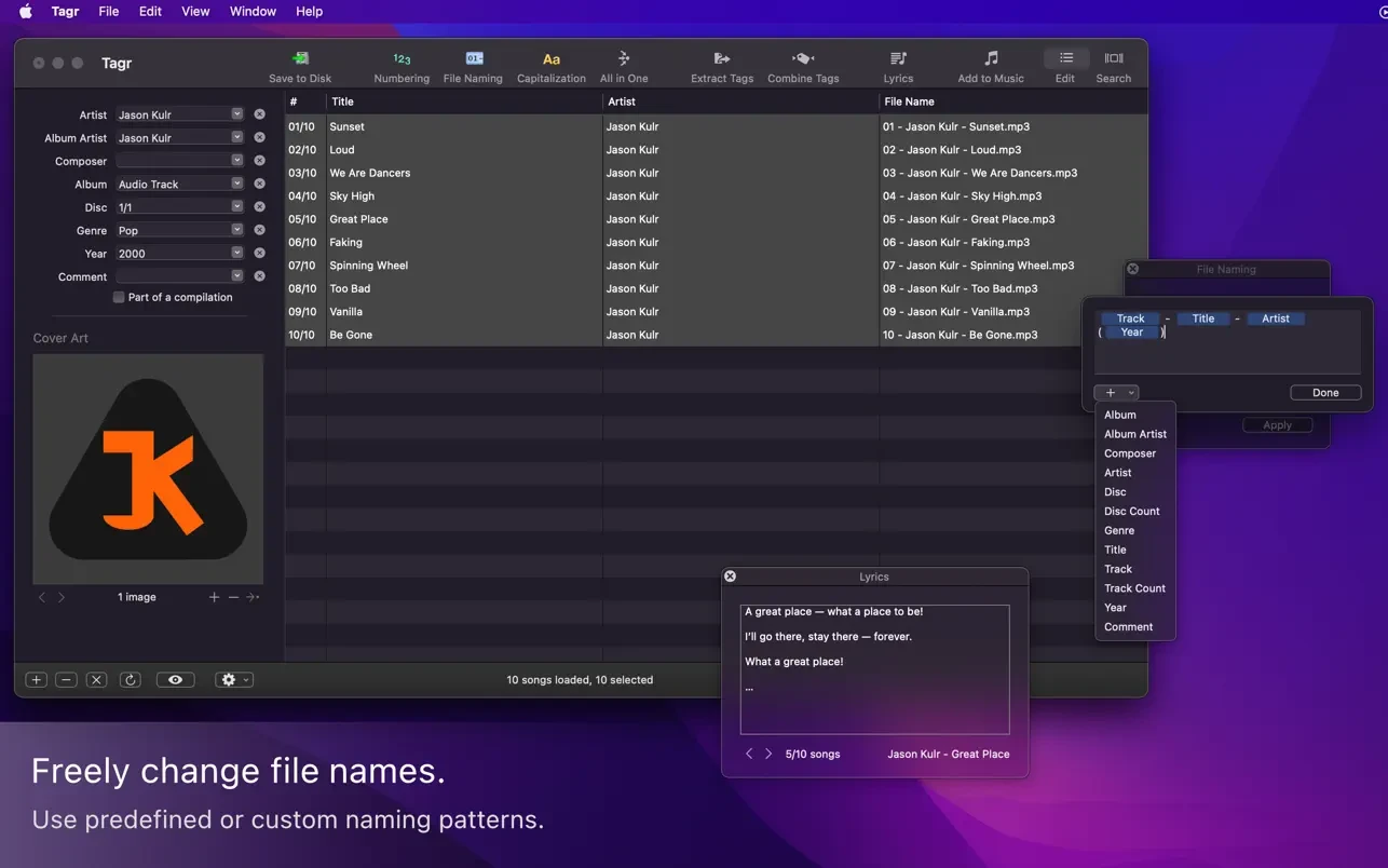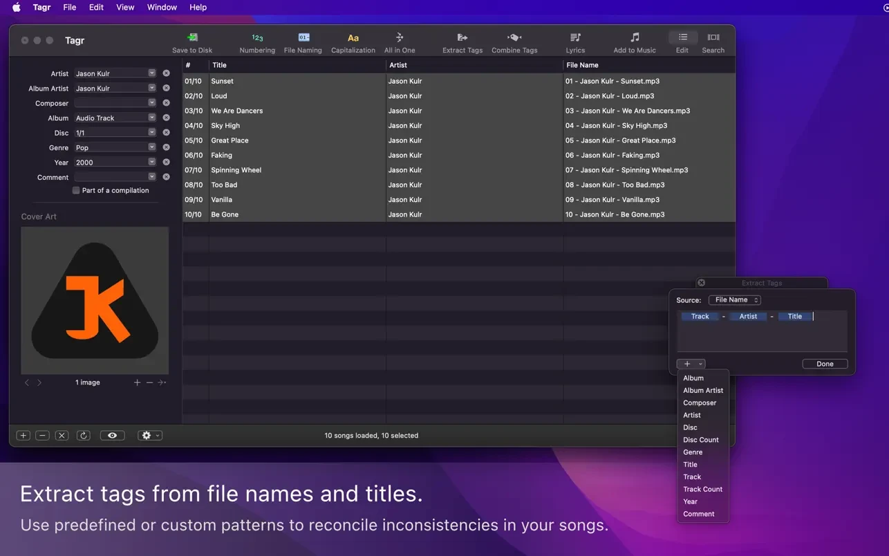 - 有时,唯一有意义的信息来源是文件名本身:标签没有维护,在线搜索没有产生任何结果。Tagr让你满意。只需定义从文件名中提取的标签,然后让Tagr完成工作。