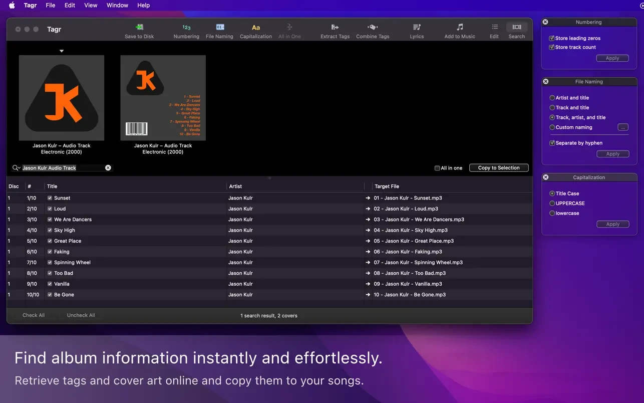 - 如果您不想手动输入歌曲,为歌曲添加缺失标签信息的最佳方法是什么?搜索它!使用Tagr查询任意数量的关键字并从discogs.com检索匹配结果,在封面查看器中浏览它们,最后将标签和图稿应用于选定的歌曲。