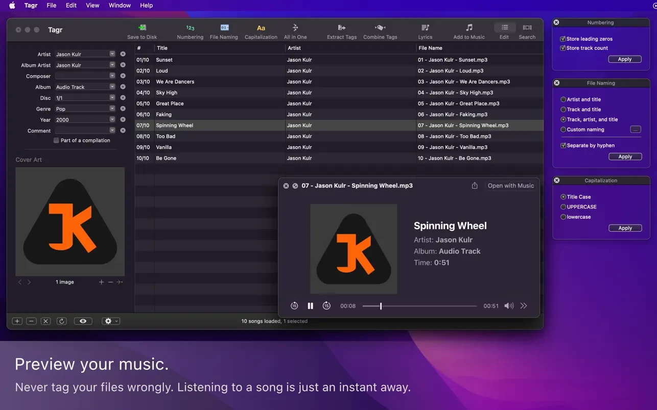 - 看着你的歌曲并看到它们都有不同的情况可能会非常令人不安。Tagr支持大写,小写和标题大小写方案(后者遵循纽约时代风格手册)。