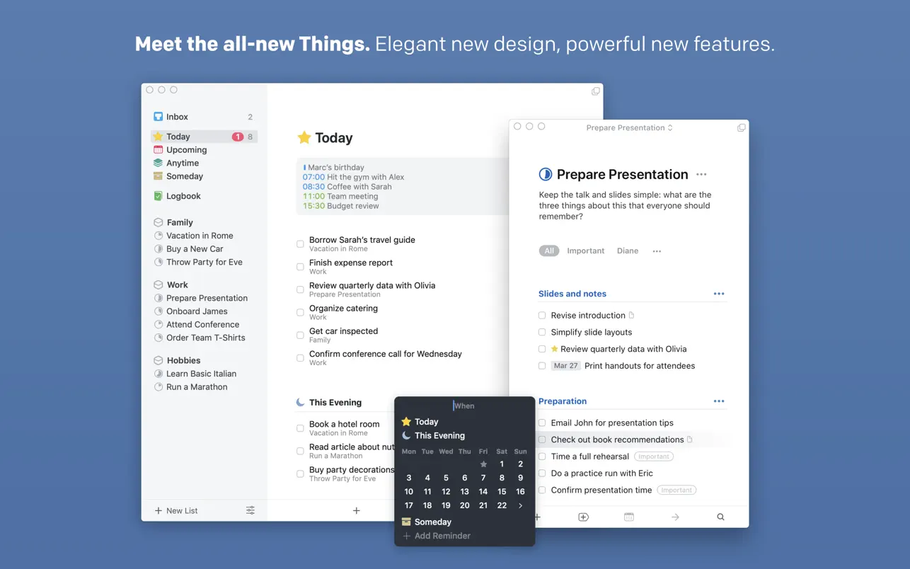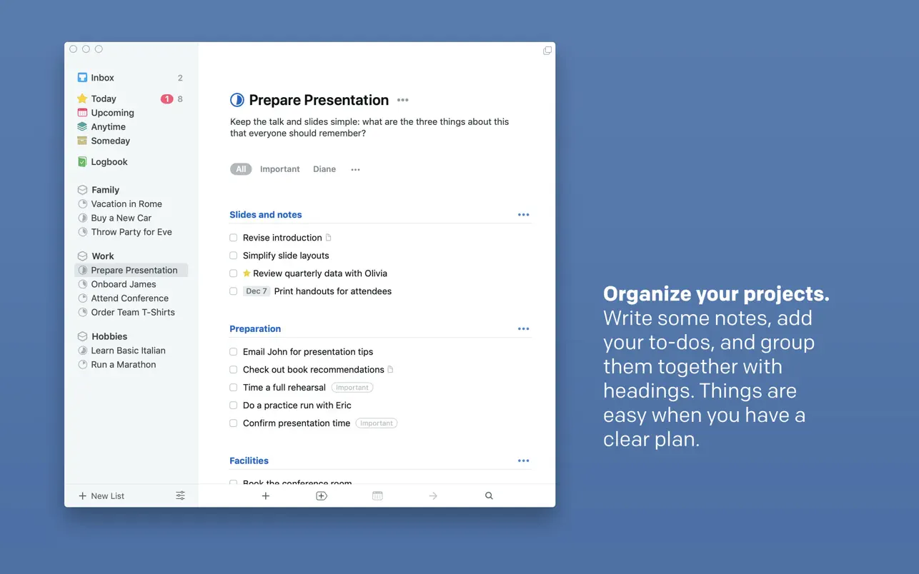 有些事情需要几个步骤来完成,但不需要一个完整的项目。对于这些情况,我们现在有了清单,它们可以帮助您分解待办事项的细节,并精确地概述完成任务所需的内容。 在购买食材清单时,或在包装旅行时使用清单。或者在工作中使用它来详细说明一个过程,这样您就不会错过关键步骤。您甚至可以粘贴其他应用程序的项目符号列表,而且Things会将其转换为您的清单。
