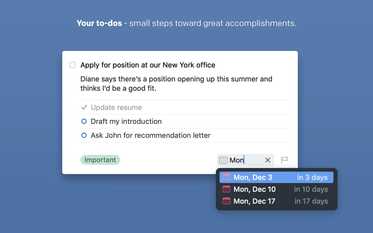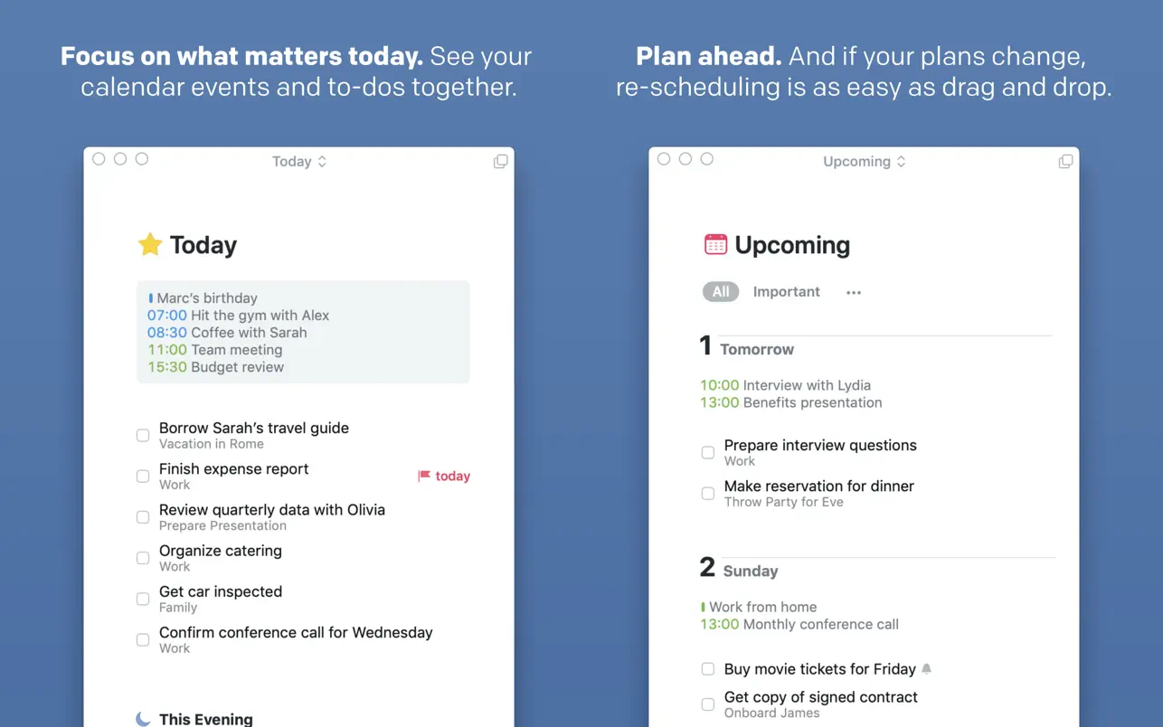 使用新的“即将到来”列表计划您的一周。它显示了未来几天议程中的所有内容:计划待办事项,重复待办事项,截止日期和日历事件。 快速查看此列表是保持最佳状态所需的一切 – 如果您的计划发生变化,重新安排您的待办事项就像拖放一样简单。