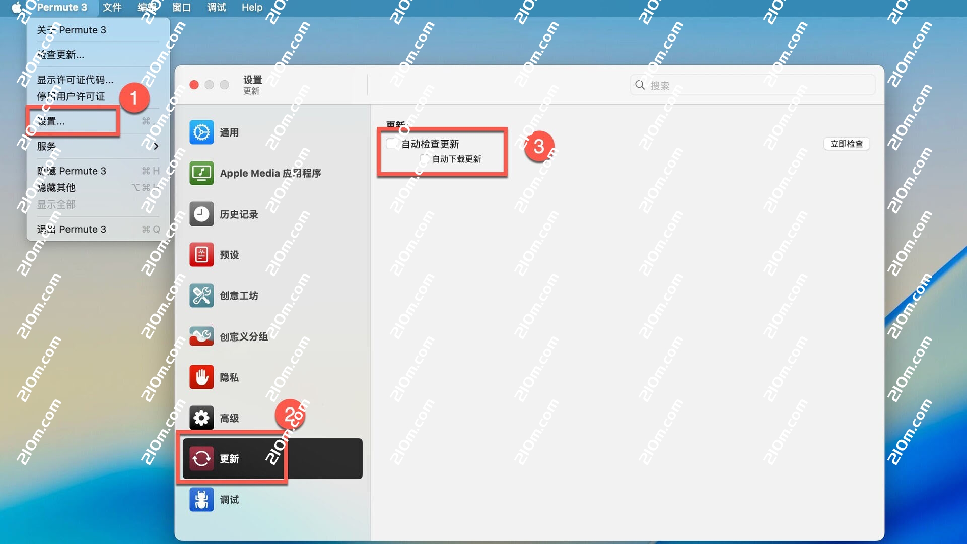 初次使用软件,找到设置-更新,把自动检查更新去掉