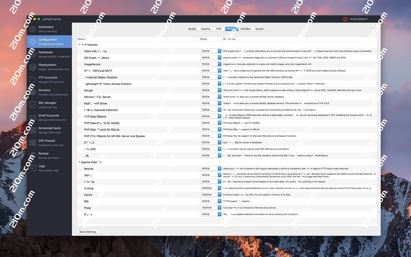 goPanel旨在与专用服务器或虚拟专用服务器一起使用。您可以安装和管理以下服务:Apache或Nginx,PHP,MySQL或MariaDB,MAIl Server和FTP。